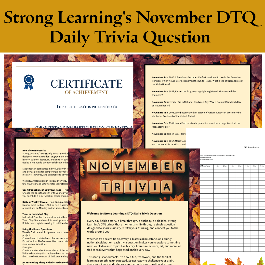 Ignite curiosity and boost engagement with this flexible trivia set, designed for daily warm-ups, homework, building community, or fun Fridays. Includes questions across U.S. history, government, science, and more, perfect for quick review or team challenges all year long.